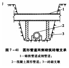 13864268088混凝土或鋼筋混凝土預和圓形管道與銅管道或鑄鐵管道交叉混凝土或鋼筋混凝土預制圓形管道與其上方鋼管道或鈍鐵管道交叉且同時施工,當青島水泥管或鑄鐵管道的內徑不大于400mm時,宜在混凝土管道兩側砌筑磚墩支承,如圖7-41所示。