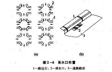 雨水口布置應根據地形及匯水面積確定。一般在道路交叉口的匯水點,低洼地段、直線段一定距離內,均應設置葡水口。如圖2-6所示。