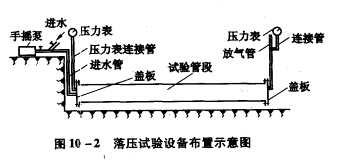 水泥管管道強(qiáng)度試驗也稱落壓試驗,其試驗設(shè)備布置如圖10-2所示。水泥管管道試驗時,可用試壓泵向管內(nèi)滾水分級升壓。每升壓一級,都應(yīng)峻查后背、支墩、管身及接口的情況。如無異常時,可繼續(xù)升壓,一直到壓力升高至試驗壓力為止,保持恒壓10m1n,再檢查接口、管身,如無破損及漏水現(xiàn)象,則認(rèn)為水泥管管道強(qiáng)度試驗合格。