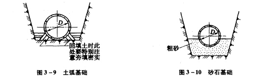 如圖3-9所示.土弧基礎是在上挖成弧形溝糟(通常采用90。弧形).管道安裝在弧形槽內。它運用于無地下水且原土能挖成弧形的平燥土攘,管徑小于僅附mm的混凝土管、鋼筋混凝土管、陶土管,管頂覆土厚度在0.7-2.0m的街坊污水管線,不在車行道下的次要管道及臨時性管道。