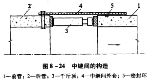 把青島水泥管管道一次頂迸的全長分成若干段,在相鄰兩段之間設(shè)置一個鋼制套管,套管與管盟主之間應(yīng)有防水措施,在套管內(nèi)的兩臂之間沿管壁均勻地安裝若干個千斤頂,該裝置稱為中繼間,如圖8-24所示。中繼間以前的管段用中繼間頂迸設(shè)備頂進,中繼向以后的管段由工作坑的主千斤頂頂進。如果一次頂進距離過長,可在頂段內(nèi)設(shè)幾個中繼間,這樣可在較小頂力的條件下,進行長距離頂管。