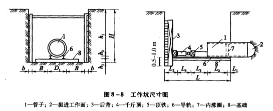 水泥管工作坑應具有足夠的空間和工作面.方能保證頂管工作順利進行。其尺寸與管徑大小、管節長度、埋置深度、操作工具及后背形式有關。工作坑的尺寸可按圖8 -8所示自公式計算得到。